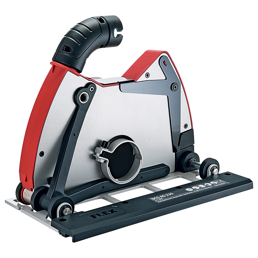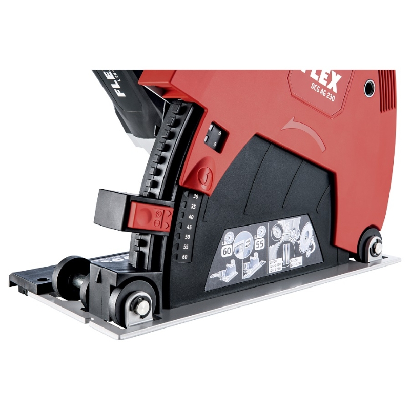 Szívótömlő csatlakozással a FLEX Clip rendszerhez és adapter a FLEX vezetősínhez. Skálázott mélységhatárolóval a vágási mélység beállításához (vezetősínnel, vagy a nélkül).